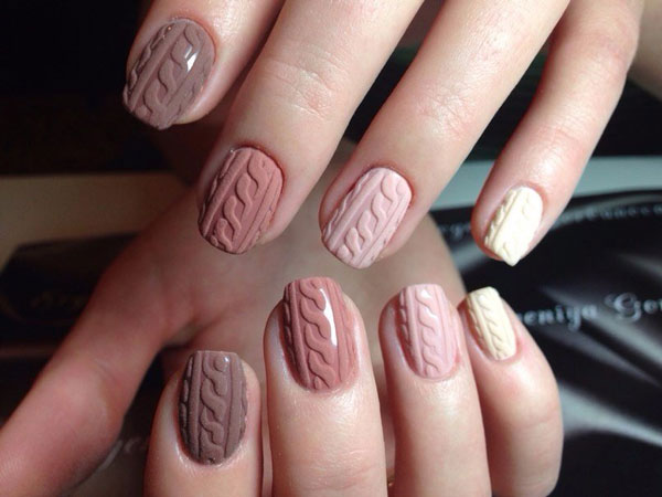 «Свитерок». В осенние заморозки хочется завернуться в теплый плед или укутаться в свитер с головы до кончиков ногтей. Вязаный узор объемного и «пушистого» маникюра подарит ощущение уюта и тепла.