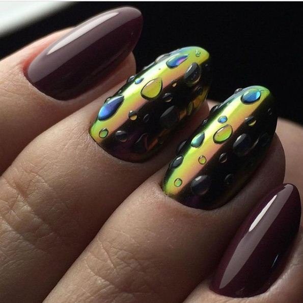 Покрытие с эффектом росы. Выполняется на матовом сером, голубом или коричневом фоне. Мастер моделирует капельки при помощи прозрачного геля. Блестящие глянцевые капли заметны и выразительно смотрятся.