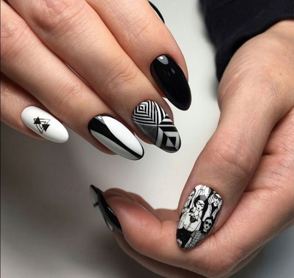 Черный с позолотой. Мрачный черный цвет разбавят золотистые геометрические линии. Это сделает маникюр нарядным и придаст ему экстравагантный вид.