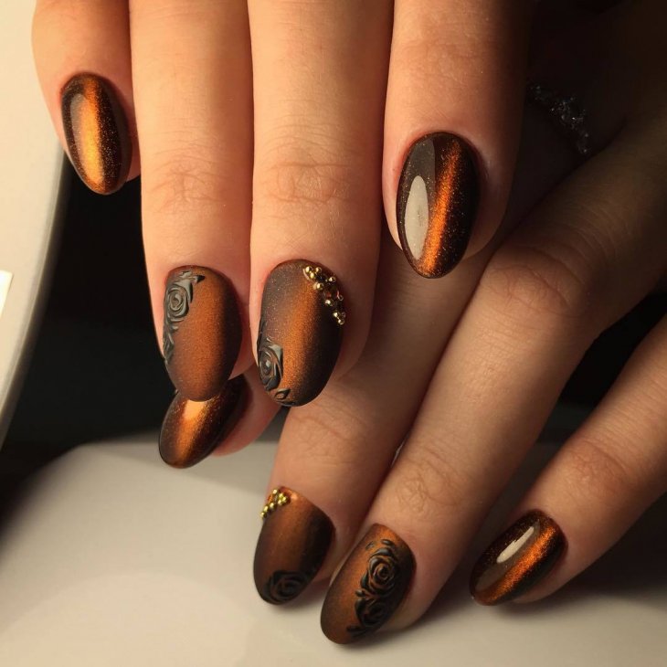 Покрытие со стразами. Осенний дизайн выполняется в матовых тонах с добавлением страз у основания ногтя. Одиночная выкладка блестящих камешков эстетично смотрится и облагораживает. В большинстве случаев выбирают оттенки кофейного цвета.