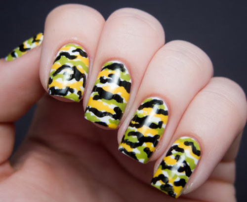 Милитари. Модницы могут выбрать привычный камуфляж или остановиться на однотонном решении. Возможно украшение стразами, блестками или нанесение объемного рисунка.