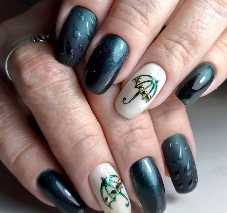 Капли дождя. Прозрачный лак создает 3D-эффект, который украсит любую дизайнерскую идею. Возможно сочетание с художественной росписью или акварельным размытием.