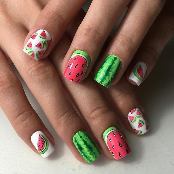 Овощи и фрукты. Время уборки урожая находит отражение в нейл-дизайне. К самым популярным «дарам природы» относятся яблоки, груши, сливы, арбузы и виноград. Из овощей — перец и морковка. Тыкву многие выбирают на Хэллоуин, но можно взять неустрашающий вариант. Яркий принт поднимет настроение назло осенней непогоде.