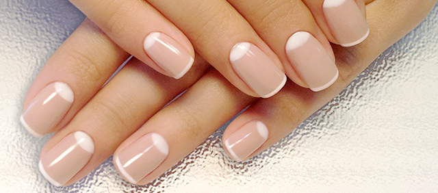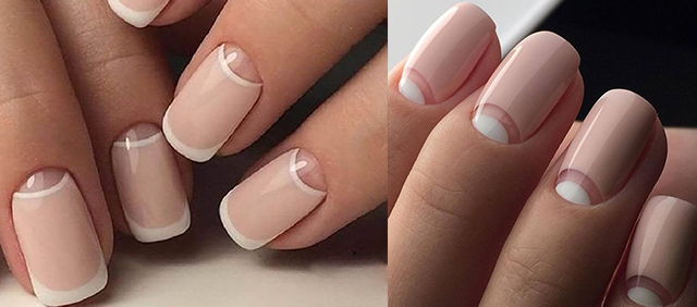 Классический френч. Ногтевую пластину в бледно-розовых или бежевых тонах оттеняет белая «улыбка». Это является универсальным вариантом для делового и повседневного стиля. Белый лак можно заменить любым светлым оттенком. Если позволяет дресс-код, можно выбрать кофейный цвет.