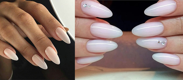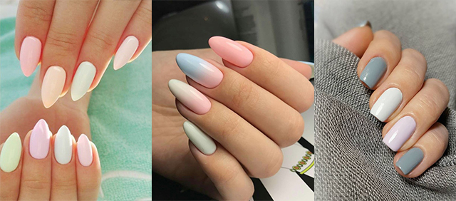 Градиент. Плавное перетекание одного нежного оттенка в другой. Кремовый и молочный, персиковый и ванильный, песочный и карамель. Возможен лаконичный арт со стразами или неброским рисунком. Допустимо применение нескольких цветов, использование горизонтального и вертикального градиента.