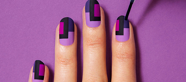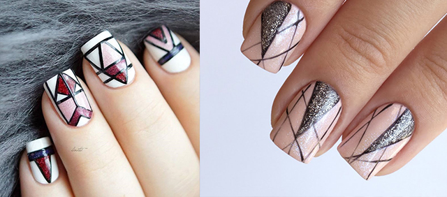 Геометрический узор. Приветствуются комбинации треугольников, ромбов и квадратов, волнообразные рисунки и зигзаги. Последний писк — серединная прямая, которая представляет собой тонкую клейкую ленту. Она разграничивает ногтевую пластину надвое. Важно выдержать цветовое соотношение. Для темных оттенков лака подойдет светлая прямая. И наоборот.