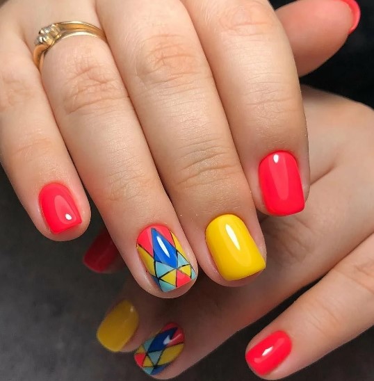 Для такого маникюр подходит любой дизайн – от классики и пастельных цветов, до ярких оттенков и смелого дизайна. Особенно выигрышно на коротких ногтях выглядят яркие цвета, хотя раньше считалось, что яркий маникюр красиво смотрится только на длинных ногтях.
